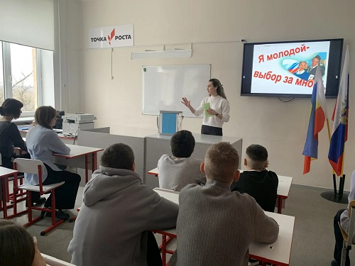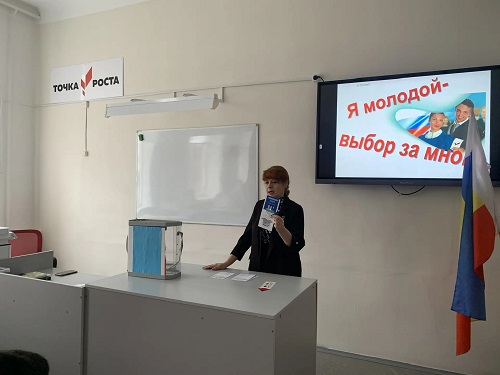 24.02.2026В рамках Месячника молодого избирателя в МБОУ Лысогорской СОШ прошел Час молодого избирателя. Учитель истории и обществознания, член УИК №1037 Дадукина Г.В. рассказала учащимся 8-11 классов о правах граждан России.